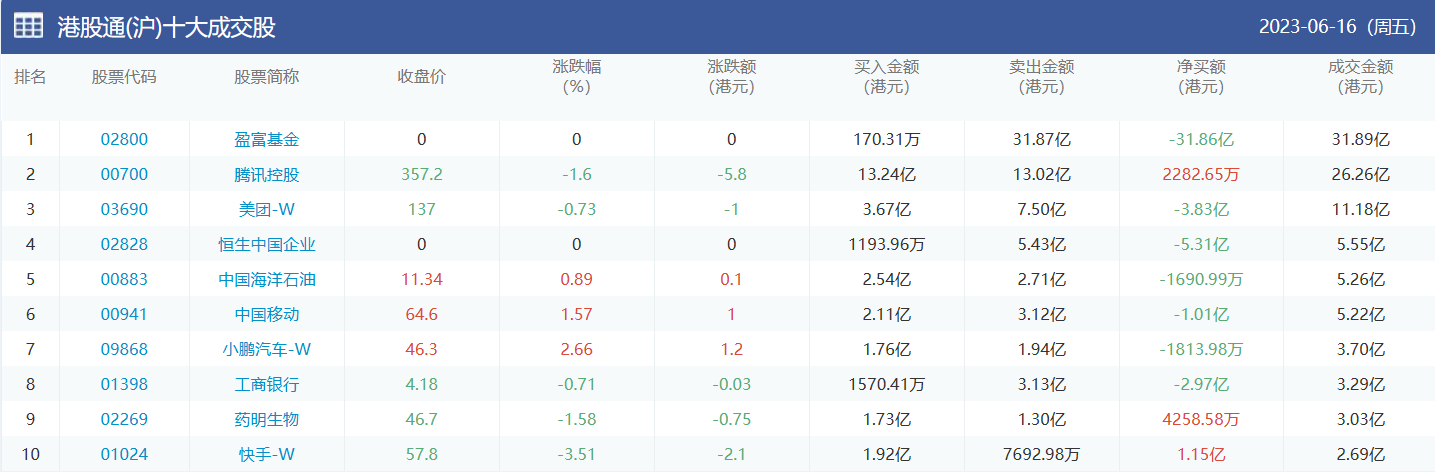 亚汇网实时数据统计:截至6月19日收盘,盈富基金、腾讯控股、美团-w位居港股通(沪)成交前三,盈富基金、腾讯控股、美团-w位居股通(深)成交前三。