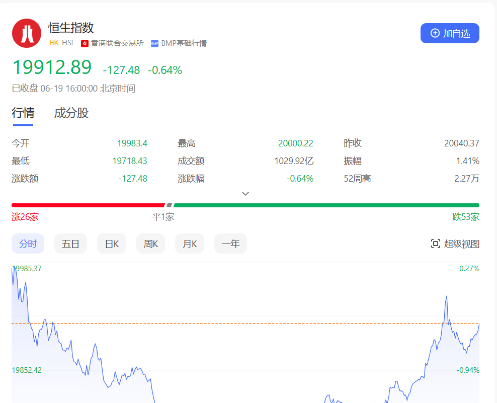 香港恒生指数开盘跌0.28%,早盘恒指低开后下跌,盘中一度跌超320点,随后全天呈窄幅震荡走势。截止收盘,恒生指数跌0.64%或127.48点,报19912.89点,全日成交额1029.92亿港元;恒生国企指数跌0.83%,报6776.55点;恒生科技指数跌1.3%,报4178.25点。