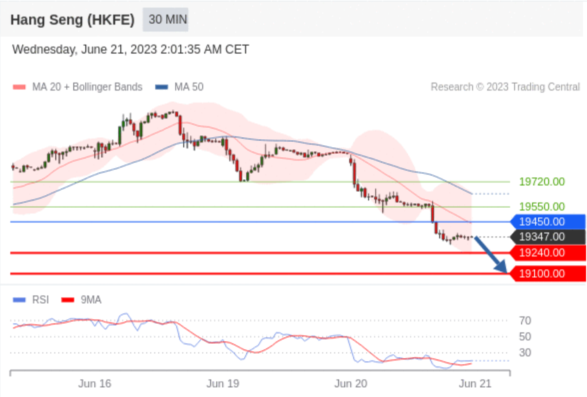 交易策略: 在 19450.00 之下,看跌,目标价位为 19240.00 ,然后为 19100.00 。