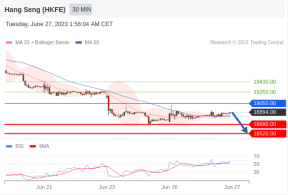交易策略: 在 19050.00 之下,看跌,目标价位为 18680.00 ,然后为 18520.00 。