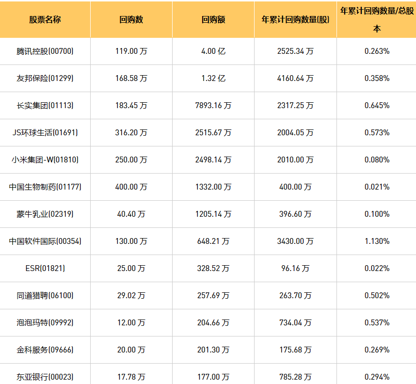 6月27日港股回购概况:伟仕佳杰(00856)、朗生医药(00503)、天福(06868)、亿胜生物科技(01061)、新时代能源(00166)、中国生物制药(01177)、汇量科技(01860)、泡泡玛特(09992)、京信通信(02342)、同道猎聘(06100)、东亚银行(00023)、清科创业(01945)、歌礼制药-B(01672)、蒙牛乳业(02319)、中国软件国际(00354)、亿都(国际控股)(00259)、现代牙科(03600)、腾讯控股(00700)、圣诺医药-B(02257)、友邦保险(01299)、长实集团(01113)、复星国际(00656)、旭日企业(00393)、中远海运国际(00517)、小米集团-W(01810)、易大宗(01733)、百宏实业(02299)、JS环球生活(01691)、ESR(01821)、康圣环球(09960)、金科服务(09666)于2023年6月23日进行了回购。其中,回购金额最大的为腾讯控股(00700),回购数量119.00 万,回购金额4.00 亿元。