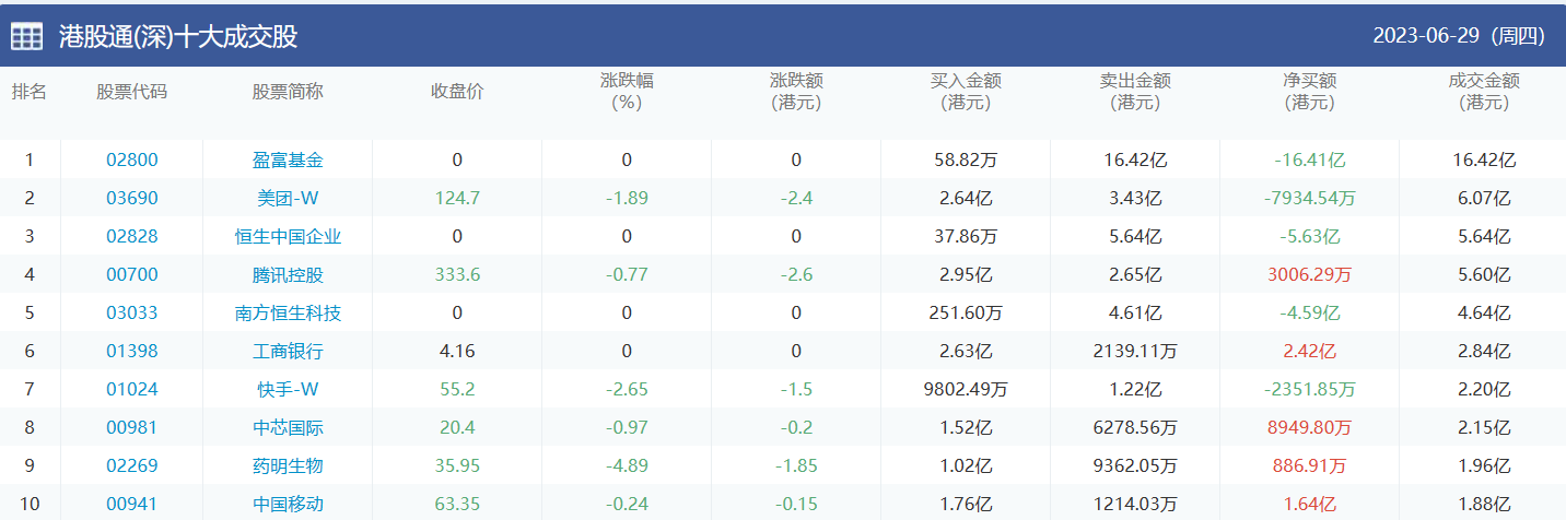 亚汇网实时数据统计:截至6月29日收盘,盈富基金、腾讯控股、药明生物位居港股通(沪)成交前三,盈富基金、美团-w、恒生中国企业位居股通(深)成交前三。
