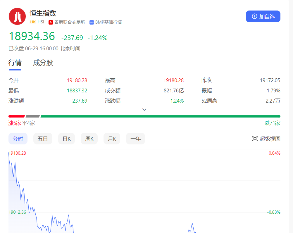 香港恒生指数开盘涨0.04%,全天呈单边下行走势。截止收盘,恒生指数跌1.24%或237.69点,报18934.36点,全日成交额821.76亿港元;恒生国企指数跌1.45%,报6426.59点;恒生科技指数跌1.71%,报3933.44点。