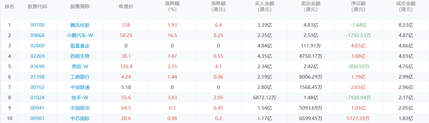 亚汇网7月3日港股通数据统计显示:盈富基金净买入额居首,达4.84亿港元,腾讯控股净卖出额居第一位。(亚汇网编辑:静香)