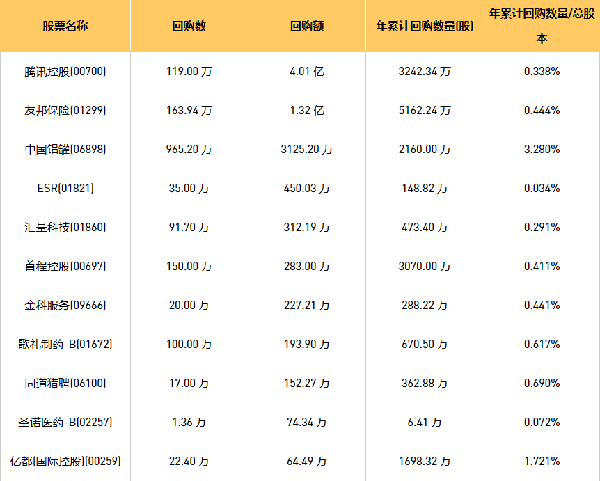 7月4日港股回购概况:朗生医药(00503)、天福(06868)、东亚银行(00023)、互太纺织(01382)、京信通信(02342)、首程控股(00697)、中国铝罐(06898)、歌礼制药-B(01672)、亿都(国际控股)(00259)、清科创业(01945)、金科服务(09666)、腾讯控股(00700)、民银资本(01141)、同道猎聘(06100)、彩客新能源(01986)、新百利融资(08439)、ESR(01821)、汇量科技(01860)、友邦保险(01299)、康圣环球(09960)、圣诺医药-B(02257)于2023年7月3日进行了回购。其中,回购金额最大的为腾讯控股(00700),回购数量119.00 万,回购金额4.01 亿元。