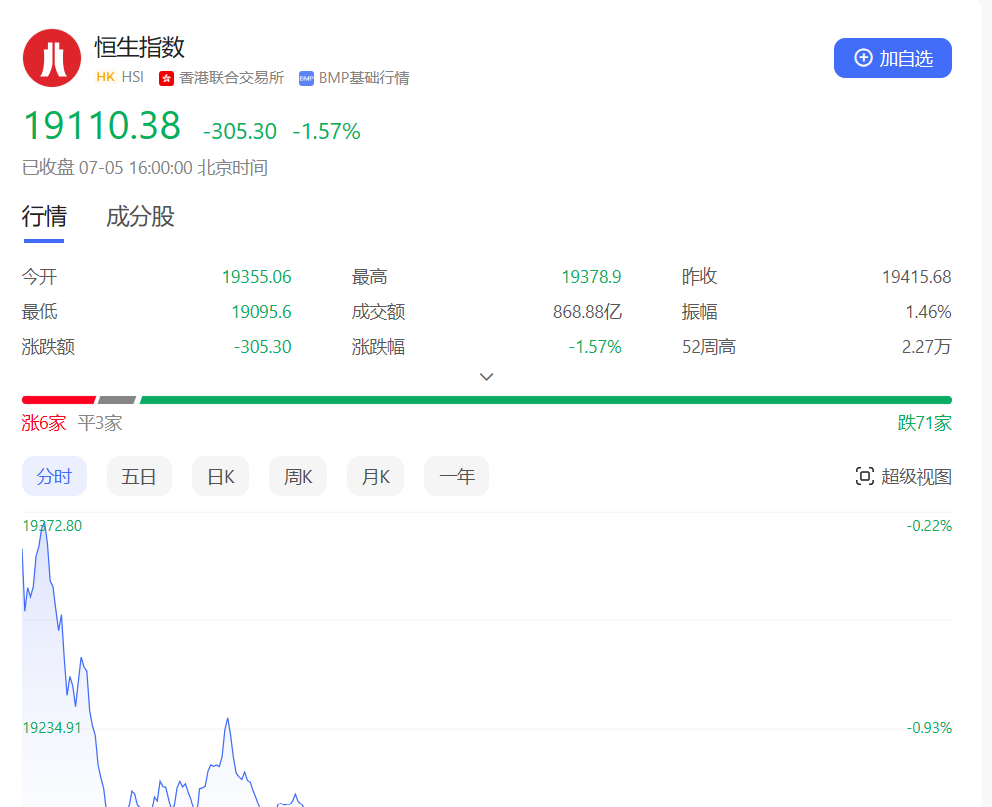 香港恒生指数开盘跌0.31%,全天维持低位震荡走势。截止收盘,恒生指数跌1.57%或305.3点,报19110.38点,全日成交额868.88亿港元;恒生国企指数跌1.87%,报6489.94点;恒生科技指数跌1.42%,报4016.53点。
