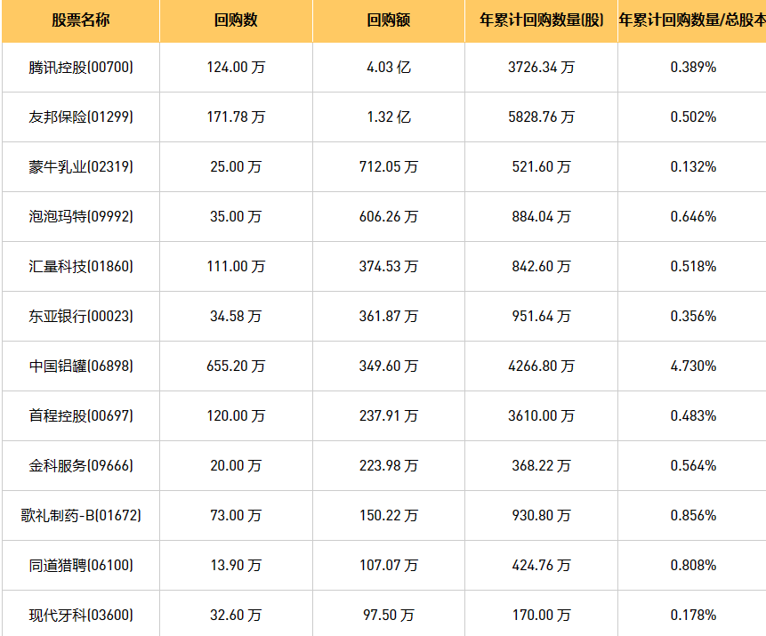 7月10日港股回购概况:天福(06868)、首程控股(00697)、亚洲金融(00662)、摩比发展(00947)、朗生医药(00503)、和谐汽车(03836)、互太纺织(01382)、清科创业(01945)、蒙牛乳业(02319)、腾讯控股(00700)、东亚银行(00023)、亿都(国际控股)(00259)、同道猎聘(06100)、兴胜创建(00896)、泡泡玛特(09992)、金科服务(09666)、中国铝罐(06898)、香港科技探索(01137)、友邦保险(01299)、现代牙科(03600)、汇量科技(01860)、歌礼制药-B(01672)、美丽田园医疗健康(02373)于2023年7月7日进行了回购。其中,回购金额最大的为腾讯控股(00700),回购数量124.00 万,回购金额4.03 亿元。