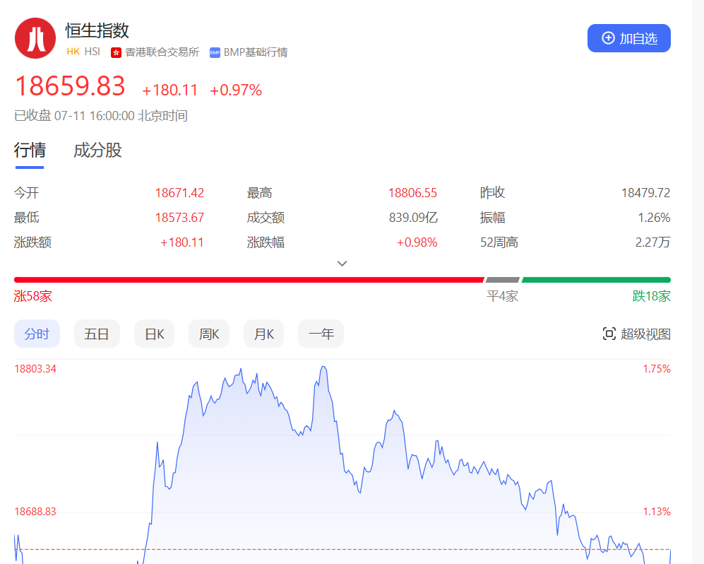 香港恒生指数开盘涨1.04%,早盘恒指高开后窄幅震荡,随后拉升走高,盘中一度涨超320点,午后涨幅则有所收窄。截止收盘,恒生指数涨0.97%或180.11点,报18659.83点,全日成交额839.09亿港元;恒生国企指数涨0.97%,报6295.85点;恒生科技指数涨1.47%,报4003.05点。