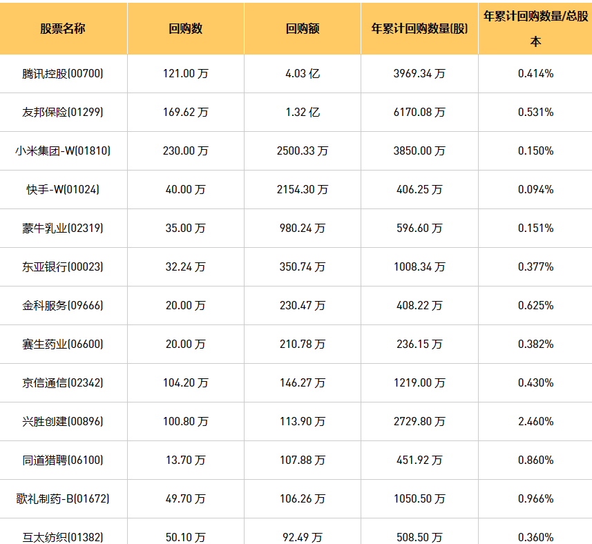 7月12日港股回购概况:和谐汽车(03836)、朗生医药(00503)、摩比发展(00947)、天福(06868)、德祥地产(00199)、同道猎聘(06100)、东亚银行(00023)、蒙牛乳业(02319)、京信通信(02342)、互太纺织(01382)、兴胜创建(00896)、亿都(国际控股)(00259)、腾讯控股(00700)、彩客新能源(01986)、盛业资本(08469)、金科服务(09666)、友邦保险(01299)、旭日企业(00393)、民银资本(01141)、歌礼制药-B(01672)、瑞安建业(00983)、汇量科技(01860)、赛生药业(06600)、乐声电子(00213)、小米集团-W(01810)、快手-W(01024)、德银天下(02418)、圣诺医药-B(02257)、ESR(01821)、康圣环球(09960)于2023年7月11日进行了回购。其中,回购金额最大的为腾讯控股(00700),回购数量121.00 万,回购金额4.03 亿元。