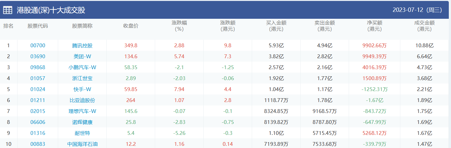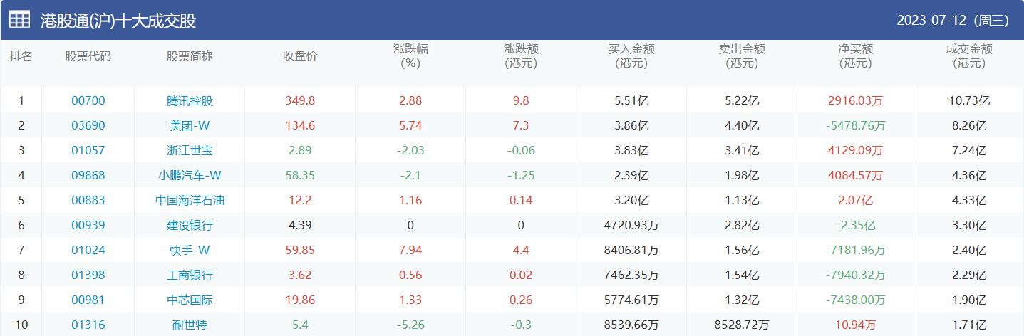 亚汇网实时数据统计:截至7月13日收盘,腾讯控股、美团-w、浙江世宝位居港股通(沪)成交前三,腾讯控股、美团-w、小鹏汽车-w位居股通(深)成交前三。