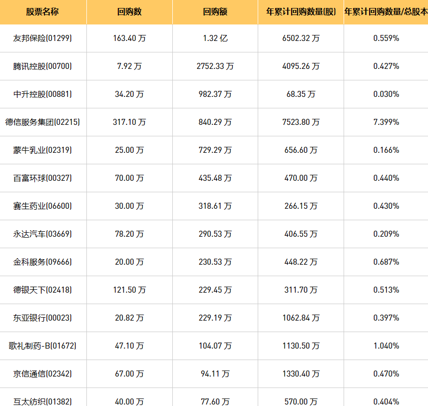 7月14日港股回购概况:摩比发展(00947)、永安国际(00289)、天福(06868)、德祥地产(00199)、互太纺织(01382)、兴胜创建(00896)、东亚银行(00023)、京信通信(02342)、腾讯控股(00700)、百富环球(00327)、同道猎聘(06100)、新百利融资(08439)、德银天下(02418)、汇量科技(01860)、亿都(国际控股)(00259)、蒙牛乳业(02319)、友邦保险(01299)、歌礼制药-B(01672)、乐声电子(00213)、永达汽车(03669)、易大宗(01733)、旭日企业(00393)、赛生药业(06600)、彩客新能源(01986)、金科服务(09666)、中升控股(00881)、康圣环球(09960)、德信服务集团(02215)于2023年7月13日进行了回购。其中,回购金额最大的为友邦保险(01299),回购数量163.40 万,回购金额1.32 亿元。