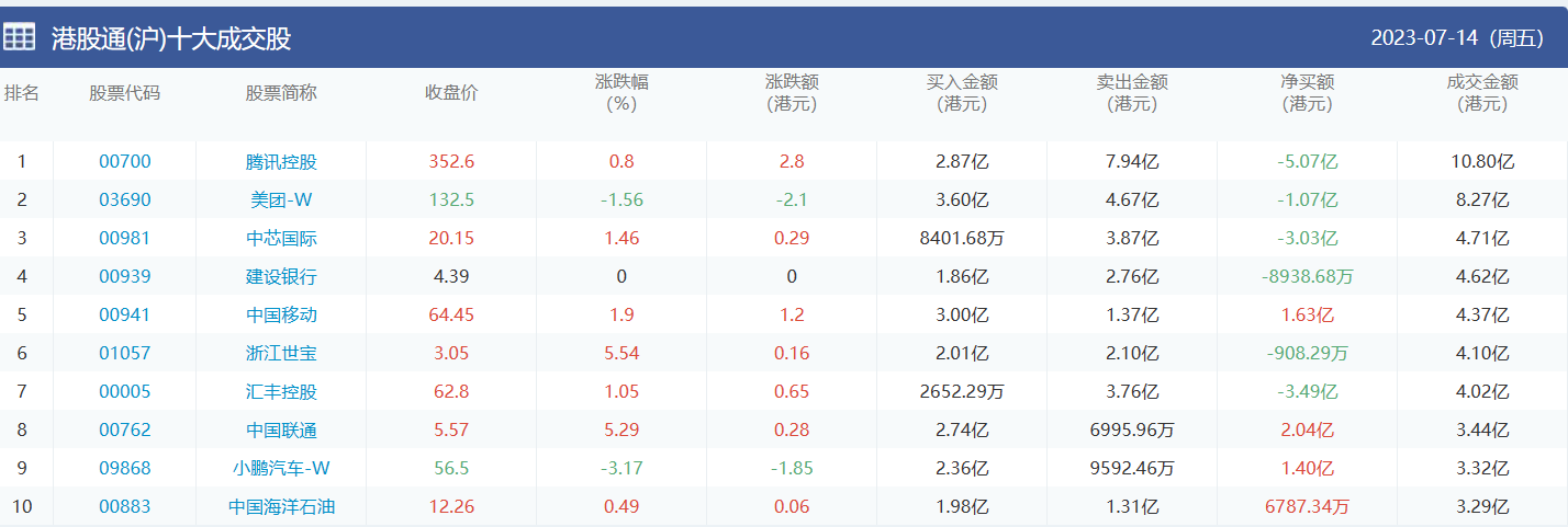 亚汇网实时数据统计:截至7月14日收盘,腾讯控股、美团-w、中芯国际位居港股通(沪)成交前三,腾讯控股、美团-w、中芯国际位居股通(深)成交前三。