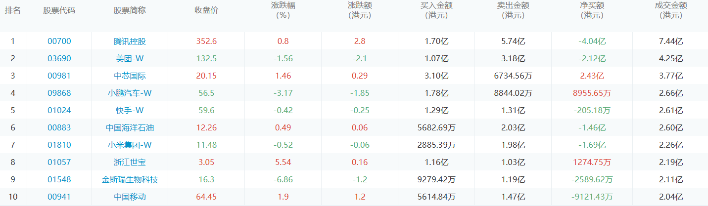 亚汇网7月17日港股通数据统计显示:中芯国际净买入额居首,达3.10亿港元,腾讯控股净卖出额居第一位。(亚汇网编辑:静香)