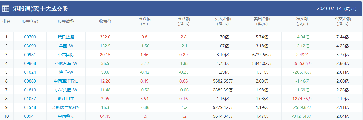 亚汇网实时数据统计:截至7月17日收盘,腾讯控股、美团-w、中芯国际位居港股通(沪)成交前三,腾讯控股、美团-w、中芯国际位居股通(深)成交前三。