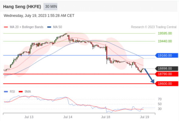 交易策略: 在 19160.00 之下,看跌,目标价位为 18790.00 ,然后为 18600.00 。