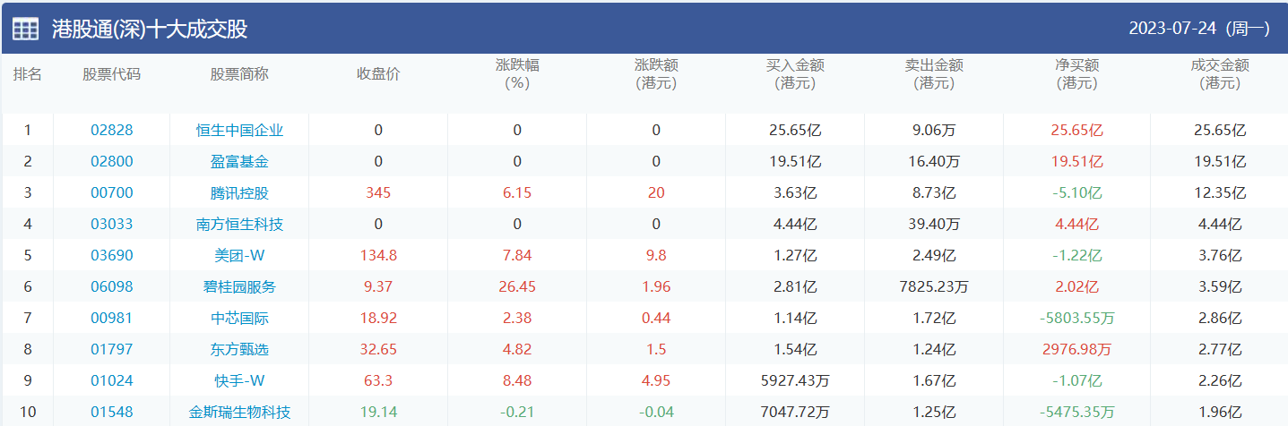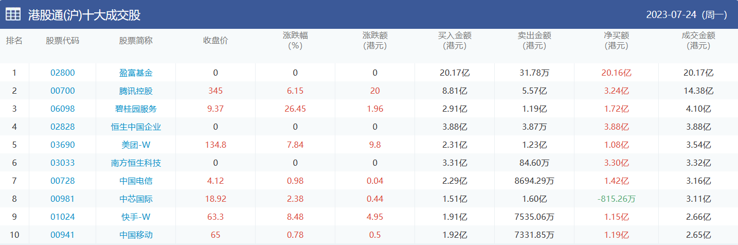 亚汇网实时数据统计:截至7月25日收盘,盈富基金、腾讯控股、碧桂园服务位居港股通(沪)成交前三,恒生中国企业、盈富基金、腾讯控股位居股通(深)成交前三。