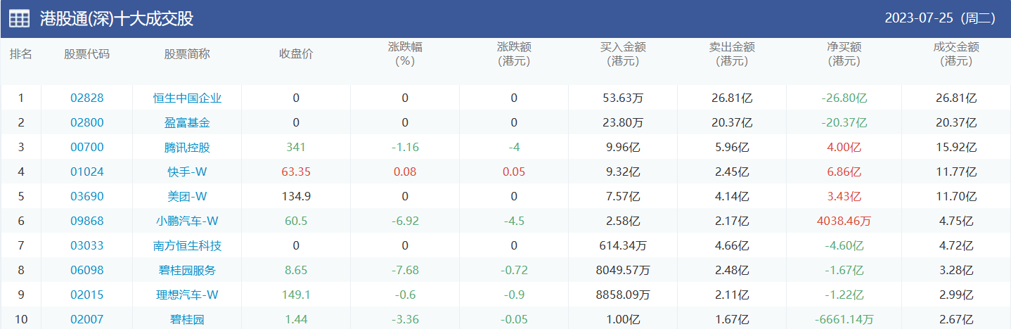 亚汇网实时数据统计:截至7月26日收盘,盈富基金、腾讯控股、盈富基金、美团-w位居港股通(沪)成交前三,恒生中国企业、盈富基金、腾讯控股位居股通(深)成交前三。
