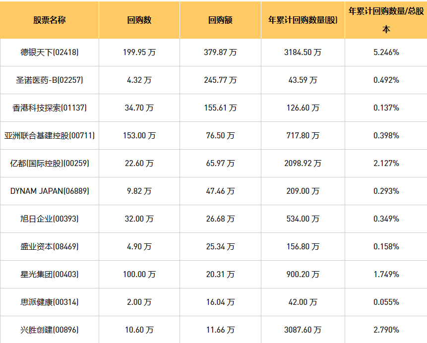 7月31日港股回购概况:亚洲联合基建控股(00711)、DYNAM JAPAN(06889)、德银天下(02418)、亿都(国际控股)(00259)、星光集团(00403)、思派健康(00314)、兴胜创建(00896)、圣诺医药-B(02257)、旭日企业(00393)、盛业资本(08469)、香港科技探索(01137)于2023年7月28日进行了回购。其中,回购金额最大的为德银天下(02418),回购数量199.95 万,回购金额379.87 万元。
