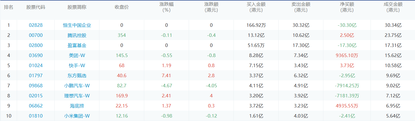 亚汇网8月1日港股通数据统计显示:腾讯控股净买入额居首,达13.12亿港元,恒生中国企业净卖出额居第一位。(亚汇网编辑:静香)