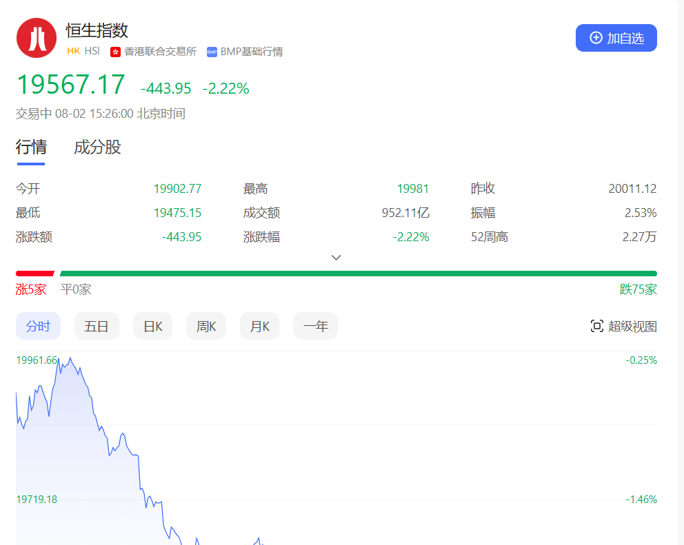 香港恒生指数开盘跌0.54%,三大指数全天震荡下行。截止收盘,恒生指数跌2.47%或493.74点,报19517.38点,全日成交额1133.62亿港元;恒生国企指数跌2.7%,报6669.37点;恒生科技指数跌3.29%,报4388.77点。