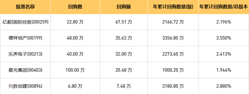 8月3日港股回购概况:德祥地产(00199)、亿都(国际控股)(00259)、星光集团(00403)、乐声电子(00213)、兴胜创建(00896)于2023年8月2日进行了回购。其中,回购金额最大的为亿都(国际控股)(00259),回购数量22.80 万,回购金额67.51 万元。