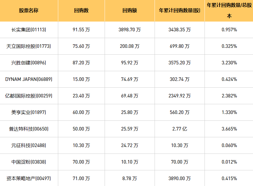 8月15日港股回购概况:元征科技(02488)、DYNAM JAPAN(06889)、资本策略地产(00497)、美亨实业(01897)、普达特科技(00650)、亿都(国际控股)(00259)、兴胜创建(00896)、中国淀粉(03838)、天立国际控股(01773)、长实集团(01113)于2023年8月14日进行了回购。其中,回购金额最大的为长实集团(01113),回购数量91.55 万,回购金额3898.70 万元。