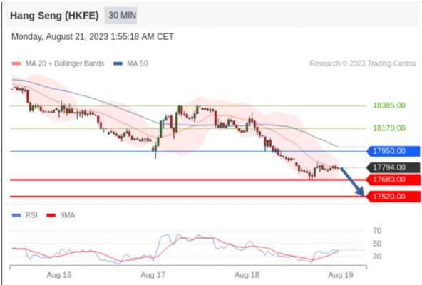 交易策略: 在 17950.00 之下,看跌,目标价位为 17680.00 ,然后为 17520.00 。