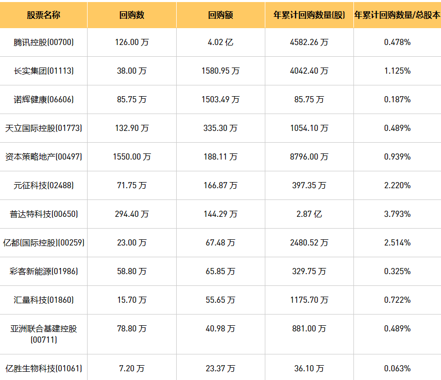 8月23日港股回购概况:摩比发展(00947)、元征科技(02488)、亿胜生物科技(01061)、资本策略地产(00497)、新鸿基公司(00086)、普达特科技(00650)、天福(06868)、亿都(国际控股)(00259)、腾讯控股(00700)、汇量科技(01860)、彩客新能源(01986)、天立国际控股(01773)、长实集团(01113)、兴胜创建(00896)、亚洲联合基建控股(00711)、诺辉健康(06606)于2023年8月22日进行了回购。其中,回购金额最大的为腾讯控股(00700),回购数量126.00 万,回购金额4.02 亿元。