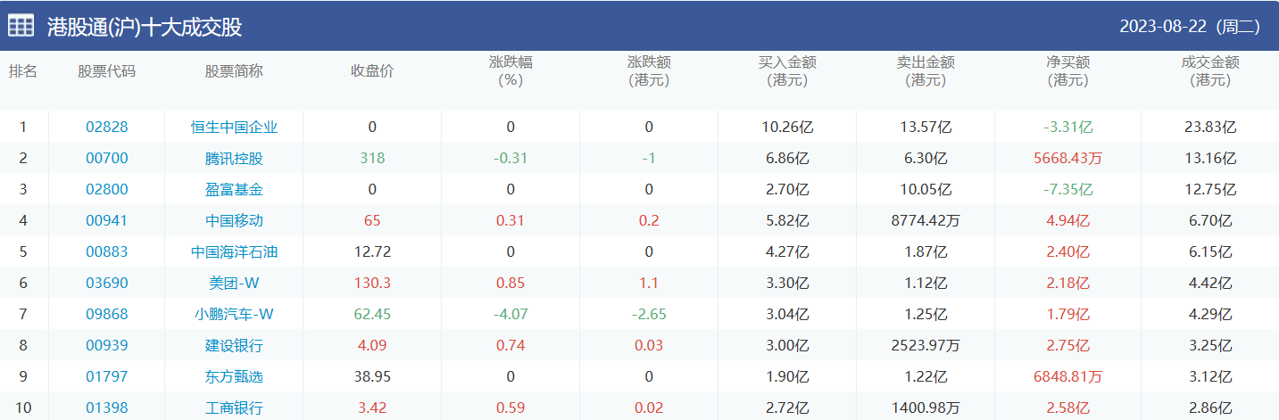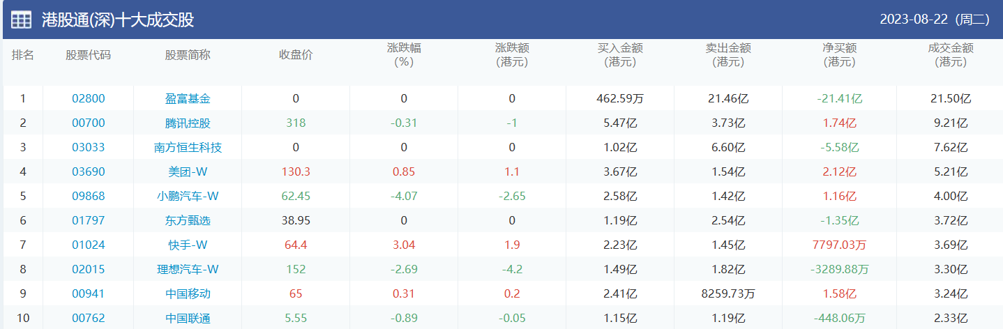 亚汇网实时数据统计:截至8月23日收盘,恒生中国企业、腾讯控股、盈富基金位居港股通(沪)成交前三,盈富基金、腾讯控股、南方恒生科技位居股通(深)成交前三。