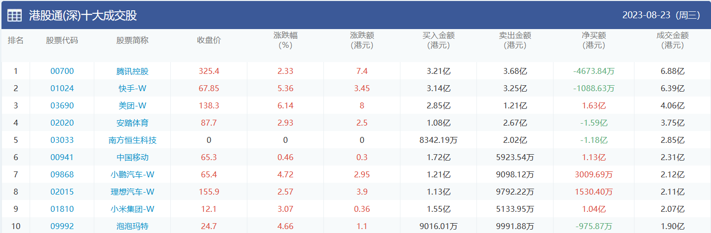 亚汇网实时数据统计:截至8月24日收盘,安踏体育、腾讯控股、中国海洋石油位居港股通(沪)成交前三,、腾讯控股、快手-w、美团-w位居股通(深)成交前三。