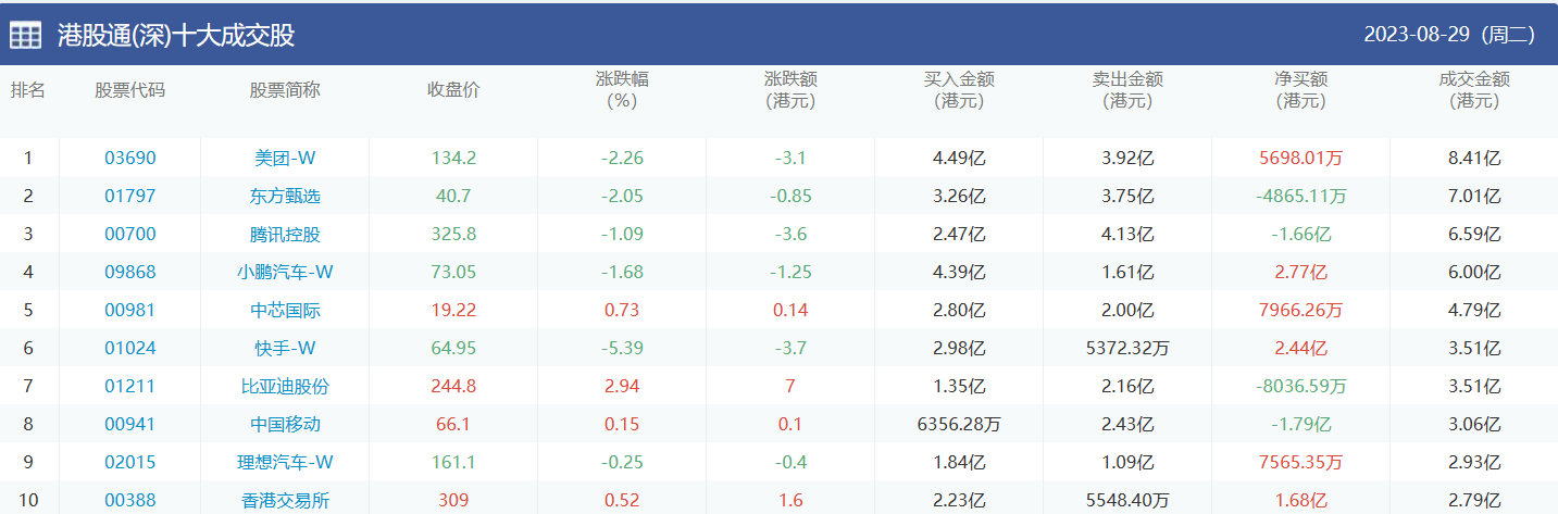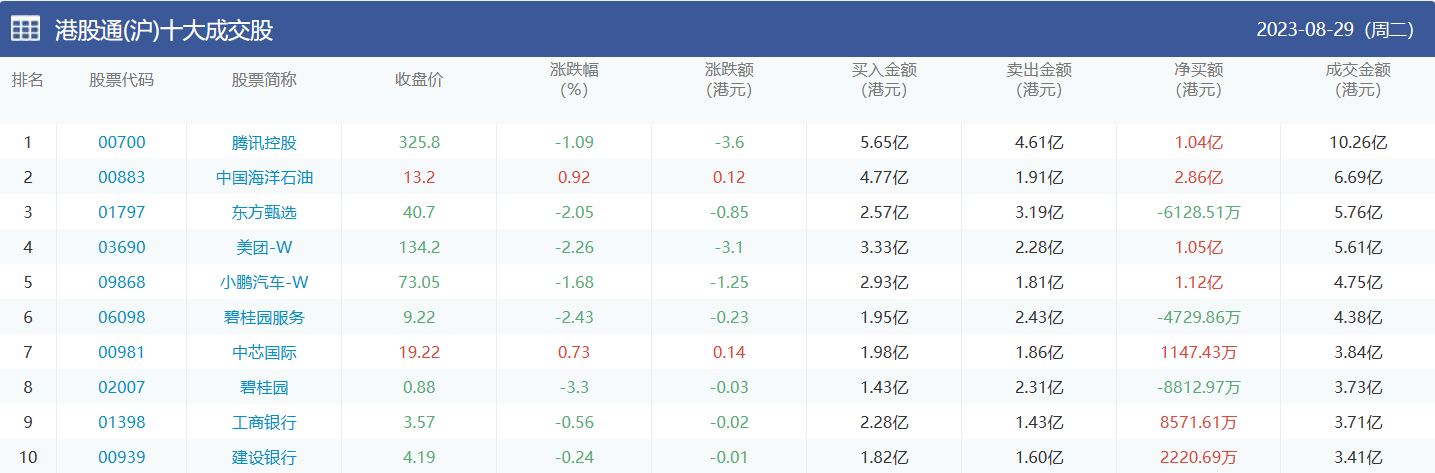 亚汇网实时数据统计:截至8月30日收盘,腾讯控股、中国海洋石油、东方甄选位居港股通(沪)成交前三,美团-w、东方甄选、腾讯控股位居股通(深)成交前三。