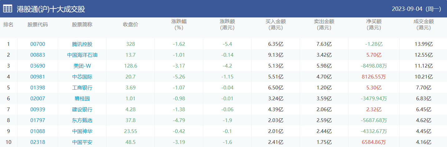 亚汇网实时数据统计:截至9月5日收盘,腾讯控股、中国海洋石油、美团-w位居港股通(沪)成交前三,美团-w、腾讯控股、中芯国际位居股通(深)成交前三。(亚汇网编辑:静香)