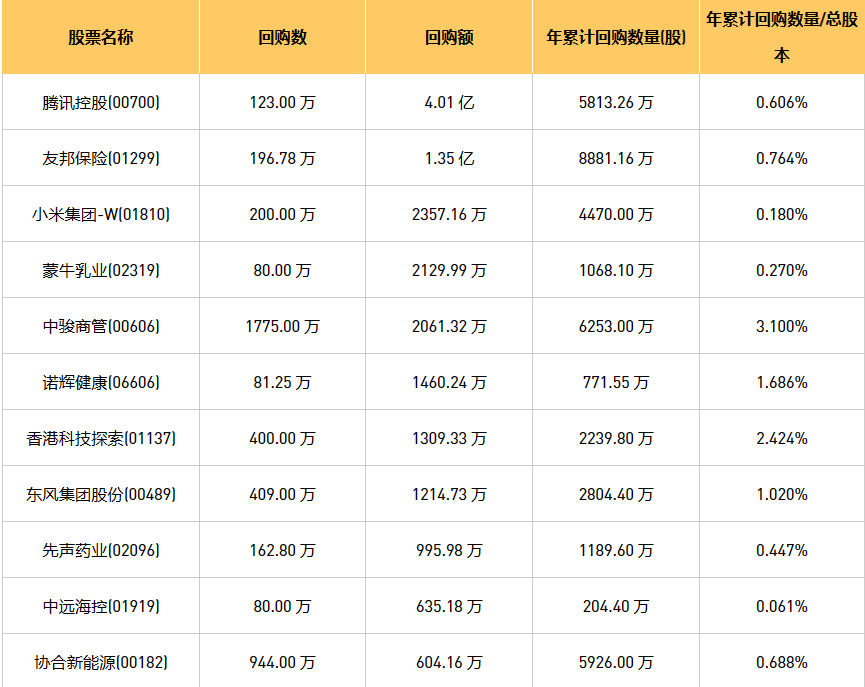 9月7日港股回购概况:摩比发展(00947)、首程控股(00697)、晨讯科技(02000)、创维集团(00751)、DYNAM JAPAN(06889)、伟仕佳杰(00856)、亿胜生物科技(01061)、天福(06868)、中骏商管(00606)、昊海生物科技(06826)、腾讯控股(00700)、新鸿基公司(00086)、百富环球(00327)、富智康集团(02038)、清科创业(01945)、百宏实业(02299)、汇量科技(01860)、民银资本(01141)、星盛商业(06668)、蒙牛乳业(02319)、碧桂园服务(06098)、彩客新能源(01986)、乐声电子(00213)、歌礼制药-B(01672)、同道猎聘(06100)、中远海控(0)、东风集团股份(00489)、固生堂(02273)、友邦保险(01299)、赛晶科技(00580)、诺辉健康(06606)、创胜集团-B(06628)、小米集团-W(01810)、金科服务(09666)、现代牙科(03600)、快手-W(01024)、先声药业(02096)、协合新能源(00182)、ESR(01821)、香港科技探索(01137)、康圣环球(09960)、天立国际控股(01773)于2023年9月6日进行了回购。其中,回购金额最大的为腾讯控股(00700),回购数量123.00 万,回购金额4.01 亿元。