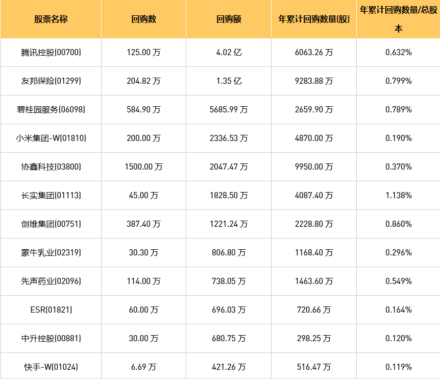 9月12日港股回购概况:伟仕佳杰(00856)、摩比发展(00947)、亿胜生物科技(01061)、DYNAM JAPAN(06889)、清科创业(01945)、蒙牛乳业(02319)、新鸿基公司(00086)、友邦保险(01299)、腾讯控股(00700)、富智康集团(02038)、固生堂(02273)、创维集团(00751)、创胜集团-B(06628)、首程控股(00697)、中远海控(0)、现代牙科(03600)、彩客新能源(01986)、绿城服务(02869)、天福(06868)、天立国际控股(01773)、先声药业(02096)、赛晶科技(00580)、歌礼制药-B(01672)、乐声电子(00213)、长实集团(01113)、同道猎聘(06100)、汇量科技(01860)、星盛商业(06668)、碧桂园服务(06098)、小米集团-W(01810)、香港科技探索(01137)、美丽田园医疗健康(02373)、快手-W(01024)、思派健康(00314)、ESR(01821)、康圣环球(09960)、协鑫科技(03800)、移卡(09923)、中升控股(00881)、立基工程控股(08369)于2023年9月11日进行了回购。其中,回购金额最大的为腾讯控股(00700),回购数量125.00 万,回购金额4.02 亿元。