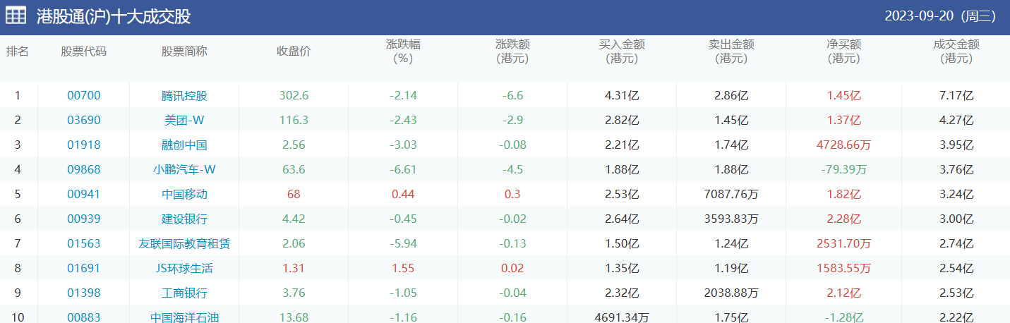 亚汇网实时数据统计:截至9月21日收盘,腾讯控股、美团-w、融创中国位居港股通(沪)成交前三,盈富基金、小鹏汽车、快手-w位居股通(深)成交前三。