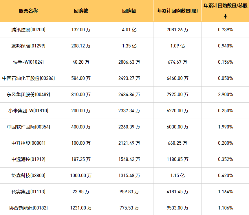 9月22日港股回购概况:伟仕佳杰(00856)、摩比发展(00947)、富智康集团(02038)、首佳科技(00103)、新鸿基公司(00086)、天福(06868)、绿城服务(02869)、DYNAM JAPAN(06889)、清科创业(01945)、亿胜生物科技(01061)、百富环球(00327)、金科服务(09666)、东风集团股份(00489)、澳能建设(01183)、中国软件国际(00354)、百宏实业(02299)、腾讯控股(00700)、旭日企业(00393)、星光集团(00403)、蒙牛乳业(02319)、创梦天地(01119)、百融云-W(06608)、友邦保险(01299)、昊海生物科技(06826)、希玛眼科(03309)、中远海控(0)、现代牙科(03600)、彩客新能源(01986)、歌礼制药-B(01672)、数码通电讯(00315)、创胜集团-B(06628)、诺诚健华(09969)、中国石油化工股份(00386)、协鑫科技(03800)、长实集团(01113)、ESR(01821)、赛晶科技(00580)、先声药业(02096)、乐声电子(00213)、复星国际(00656)、天立国际控股(01773)、快手-W(01024)、汇量科技(01860)、永达汽车(03669)、协合新能源(00182)、小米集团-W(01810)、中升控股(00881)、康圣环球(09960)、香港科技探索(01137)于2023年9月21日进行了回购。其中,回购金额最大的为腾讯控股(00700),回购数量132.00 万,回购金额4.01 亿元。