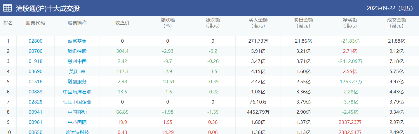 亚汇网实时数据统计:截至9月25日收盘,盈富基金、腾讯控股、融创中国位居港股通(沪)成交前三,盈富基金、腾讯控股、南方恒生科技位居股通(深)成交前三。