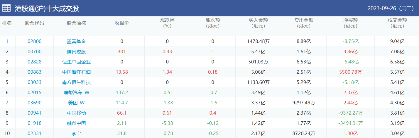 亚汇网实时数据统计:截至9月27日收盘,盈富基金、腾讯控股、恒生中国企业位居港股通(沪)成交前三,盈富基金、腾讯控股、美团-w位居股通(深)成交前三。