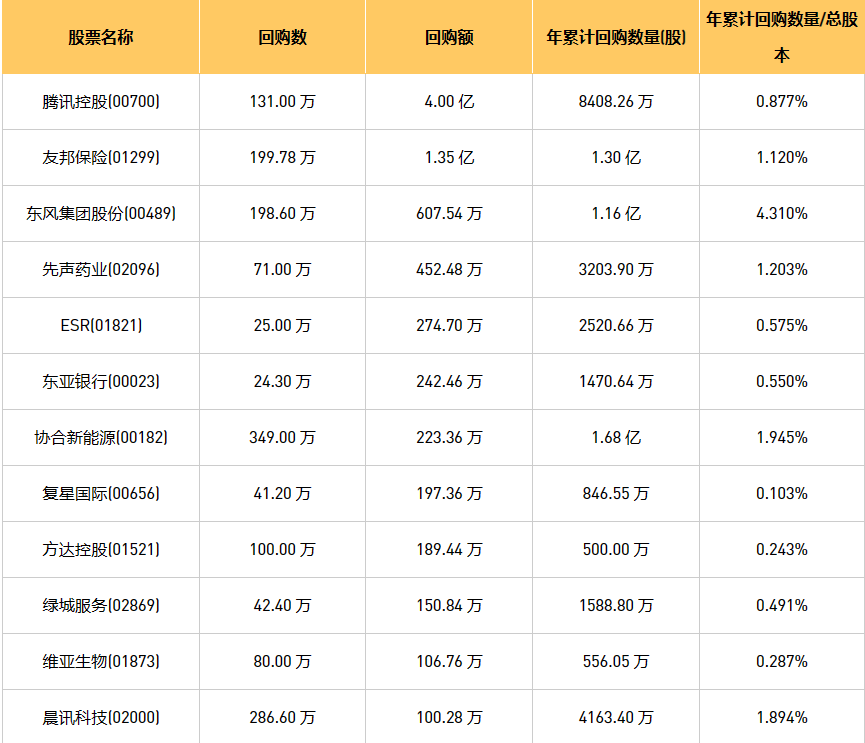 10月9日港股回购概况:摩比发展(00947)、北京能源国际(00686)、晨讯科技(02000)、东亚银行(00023)、亿胜生物科技(01061)、DYNAM JAPAN(06889)、天福(06868)、清科创业(01945)、绿城服务(02869)、首佳科技(00103)、新鸿基公司(00086)、金科服务(09666)、方达控股(01521)、友邦保险(01299)、东风集团股份(00489)、腾讯控股(00700)、亿都(国际控股)(00259)、复星国际(00656)、现代牙科(03600)、协合新能源(00182)、旭日企业(00393)、汇量科技(01860)、创胜集团-B(06628)、思派健康(00314)、歌礼制药-B(01672)、希玛眼科(03309)、赛晶科技(00580)、康圣环球(09960)、维亚生物(01873)、嬴集团(00397)、中电光谷(00798)、ESR(01821)、先声药业(02096)于2023年10月6日进行了回购。其中,回购金额最大的为腾讯控股(00700),回购数量131.00 万,回购金额4.00 亿元。
