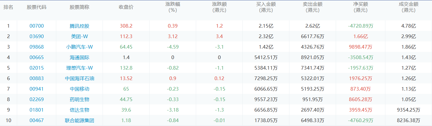 亚汇网10月10日港股通数据统计显示:美团-w净买入额居首,达2.32亿港元,腾讯控股净卖出额居第一位。