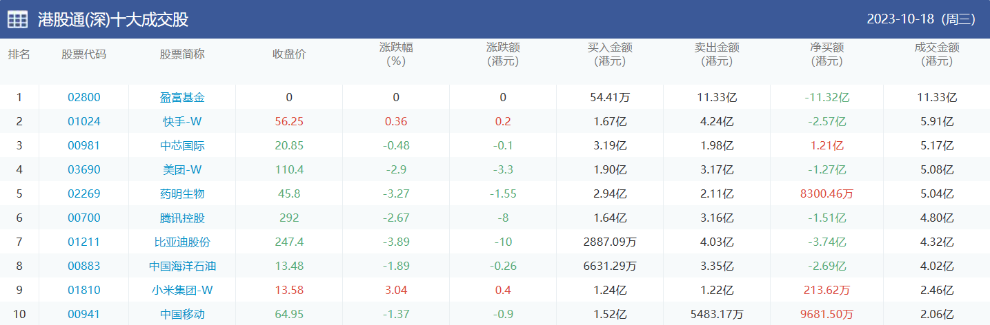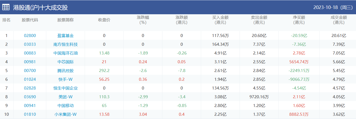 亚汇网实时数据统计:截至10月19日收盘,盈富基金、南方恒生企业、中国海洋石油位居港股通(沪)成交前三,盈富基金、快手-w、中芯国际位居股通(深)成交前三。