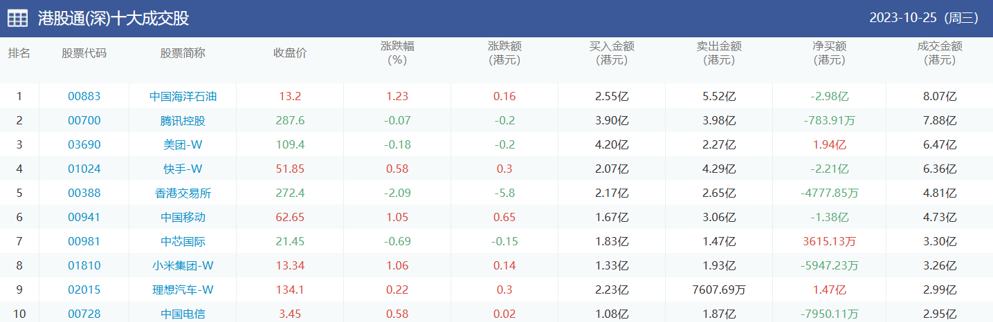 亚汇网实时数据统计:截至10月26日收盘,中国移动、腾讯控股、中国海洋石油位居港股通(沪)成交前三,中国海洋石油、腾讯控股、美团-w位居股通(深)成交前三。
