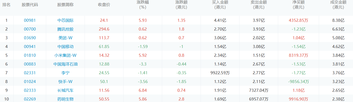 亚汇网10月30日港股通数据统计显示:中芯国际净买入额居首,达4.41亿港元,中芯国际净卖出额居第一位。