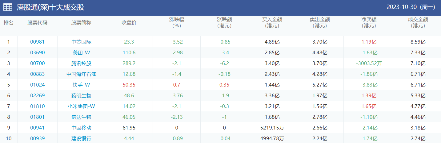 亚汇网实时数据统计:截至10月31日收盘,中芯国际、小米集团-w、腾讯控股位居港股通(沪)成交前三,中芯国际、美团-w、腾讯控股位居股通(深)成交前三。