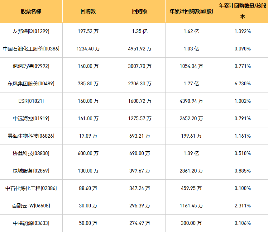 11月1日港股回购概况: 元征科技(02488)、摩比发展(00947)、伟仕佳杰(00856)、科联系统(00046)、希玛眼科(03309)、中国石油化工股份(00386)、百融云-W(06608)、东亚银行(00023)、绿城服务(02869)、友邦保险(01299)、天福(06868)、美因基因(06667)、嬴集团(00397)、中裕能源(03633)、先声药业(02096)、中远海控(0)、东风集团股份(00489)、泡泡玛特(09992)、民银资本(01141)、VESYNC(02148)、德银天下(02418)、中石化炼化工程(02386)、旭日企业(00393)、昊海生物科技(06826)、协鑫科技(03800)、歌礼制药-B(01672)、协合新能源(00182)、方达控股(01521)、中电光谷(00798)、北京能源国际(00686)、维亚生物(01873)、ESR(01821)、康圣环球(09960)于2023年10月31日进行了回购。其中,回购金额最大的为友邦保险(01299),回购数量197.52 万,回购金额1.35 亿元。