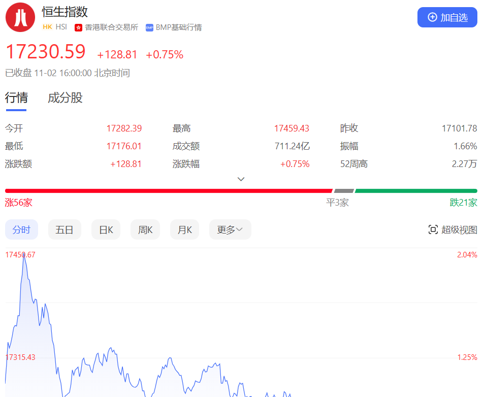 美联储11月再度暂停加息,三大指数早盘集体高开,盘初短线冲高,恒指及国指盘中涨超2%,恒科指则一度涨超3%。但随即震荡回落,午后涨幅进一步收窄。截止收盘,恒生指数涨0.75%或128.81点,报17230.59点,全日成交额711.24亿港元;恒生国企指数涨0.88%,报5911.08点;恒生科技指数涨1.63%,报3813.42点。