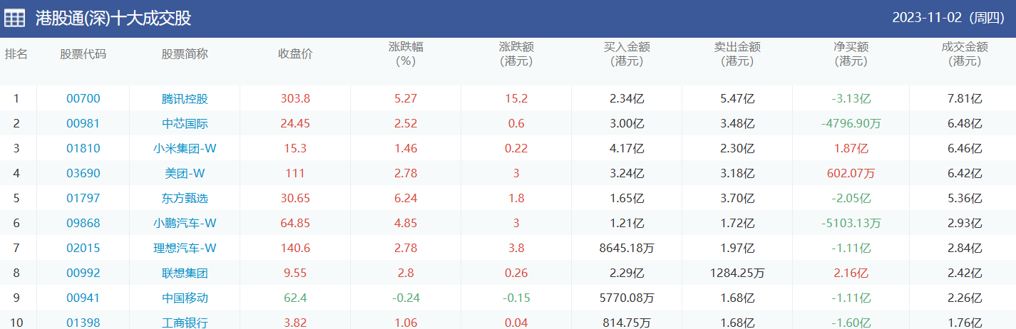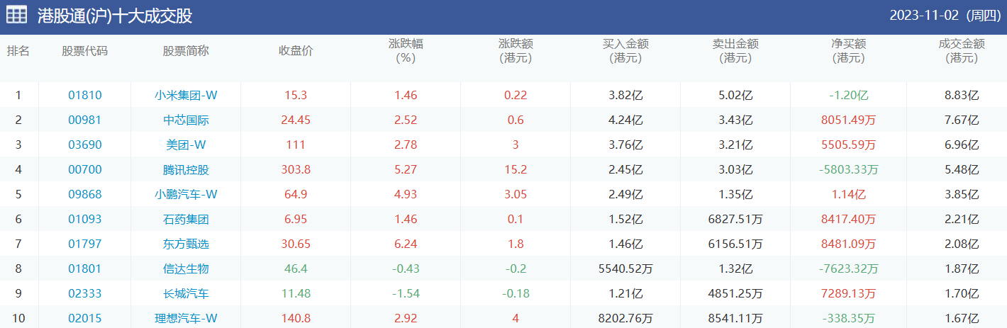 亚汇网实时数据统计:截至11月3日收盘,小米集团-w、中芯国际、美团-w位居港股通(沪)成交前三,腾讯控股、中芯国际、小米集团-w位居股通(深)成交前三。
