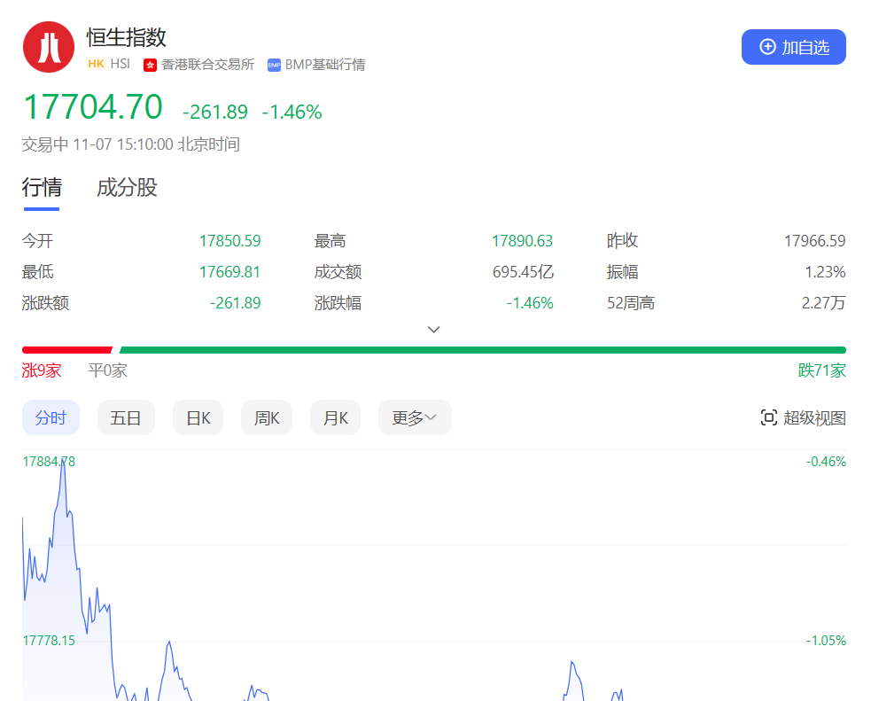 香港恒生指数开盘跌0.65%,三大指数早盘集体低开,盘初曾一度冲高,但随即上行乏力,此后全天震荡走弱。截止收盘,恒生指数跌1.65%或296.43点,报17670.16点,全日成交额896.29亿港元;恒生国企指数跌1.54%,报6087.1点;恒生科技指数跌1.04%,报4055.84点。