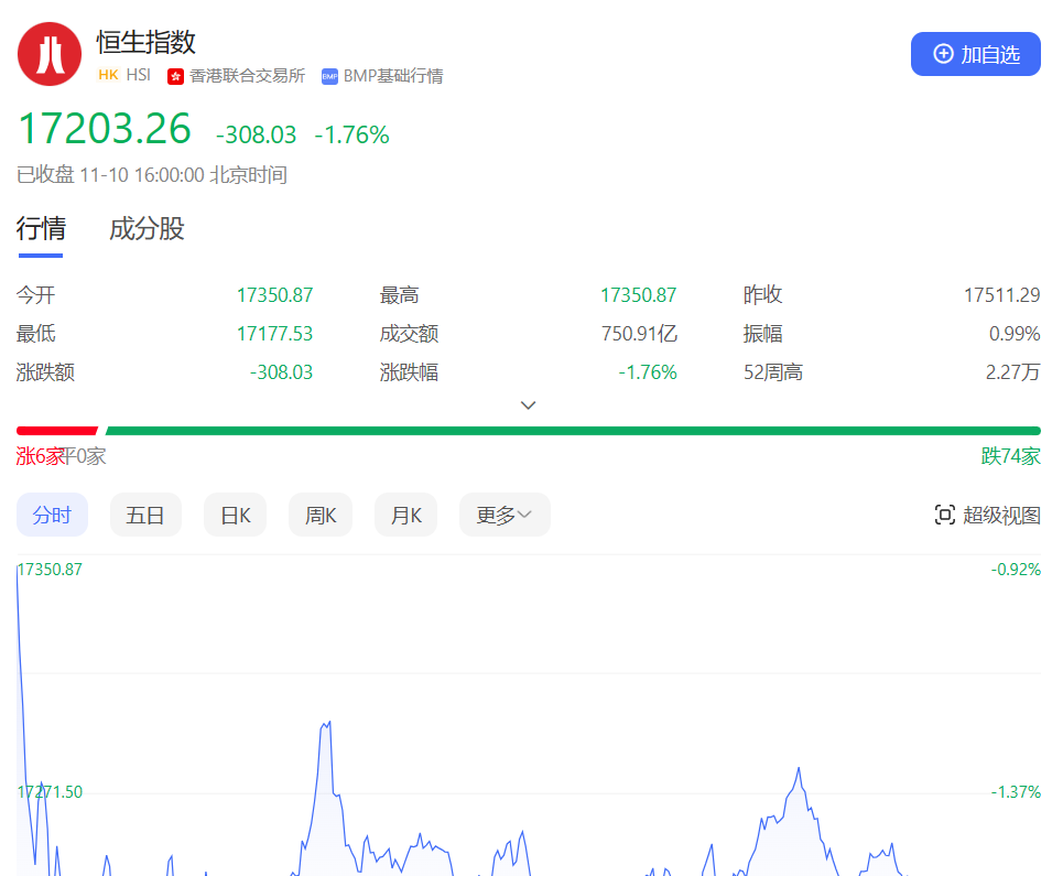 香港恒生指数开盘跌0.92%,三大指数早盘集体低开,全天震荡下挫,恒科指盘初即失守4000点大关,午后跌幅加速扩大。截止收盘,恒生指数跌1.76%或308.03点,报17203.26点,本周累计跌2.61%,全日成交额750.91亿港元;恒生国企指数跌2.15%,报5900.82点;恒生科技指数跌3.28%,报3892.44点。