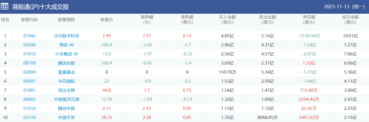 亚汇网实时数据统计:截至11月14日收盘,马克数字科技、美团-w、小米集团-w位居港股通(沪)成交前三,盈富基金、美团-w、腾讯控股位居股通(深)成交前三。